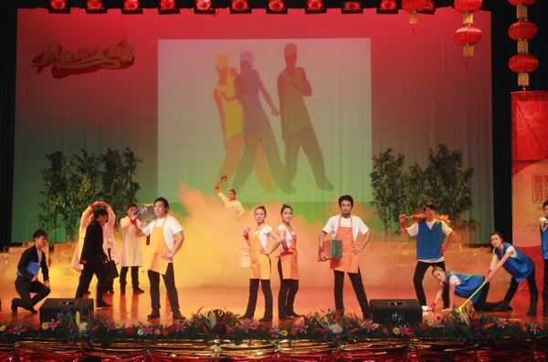 晚會在動感十足的歌舞《魅力后勤》中拉開帷幕。晚會主題突出、氣勢恢宏、形式多樣、結構緊湊、特色鮮明,展示了廣大后勤員工積極向上、奮發進取的精神面貌。現代舞《后勤人》用節奏明快、動感十足的舞蹈展現了后勤員工們用勤勞的雙手,無怨無悔做好學校教研的保障工作,體現了后勤人特別能吃苦、特別能奉獻的精神。小品《我愛我家》用質樸、真實、生動的表演,再現了后勤員工們舍小家、為大家,兢兢業業、任勞任怨、無私奉獻的精神。詩朗誦《基業長青—我們的光榮與夢想》,展示了我校后勤社會化改革十余年來從新生到崛起的巨大變化和近年來后勤集團走上快速發展、壯大之路,表達了全體后勤人奮發進取、努力拼搏,為創造后勤集團更輝煌的明天而奮斗的心聲。情景劇《早會》,展示了后勤員工飽滿的團隊勢氣和積極向上的精神風貌,集團文化展現得淋漓盡致。舞臺歌伴舞《相親相愛》,激情而高亢的旋律、動感明快的舞步表達了后勤員工對學校、集團發展的美好憧憬,將晚會推向了高潮。