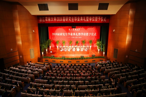 6月19日,浙江農林大學2016屆研究生畢業典禮暨學位授予儀式在東湖校區活動中心影劇院隆重舉行。校黨委書記宣勇、校長周國模、校黨委副書記方偉、副校長金佩華、紀委書記鐘平、副校長沈月琴出席畢業典禮。典禮由校黨委副書記史永安主持。