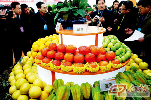 2007年12月26日,河南鄭州一展會上展示的臺灣水果。農業是海峽兩岸最具合作潛力的領域之一。自2005年大陸出臺一系列惠臺農業政策以來,臺灣優質農產品已經逐步得到大陸消費者的認可。臺灣有優良品種、先進農業技術和科學的管理經驗、外向型的農產品市場網絡;大陸有豐富的自然資源、較為完善的基礎設施和持續穩定的宏觀經濟環境。加強兩岸農業合作,可以促進兩岸調整農業結構,最終形成互惠互利、互補雙贏的局面。