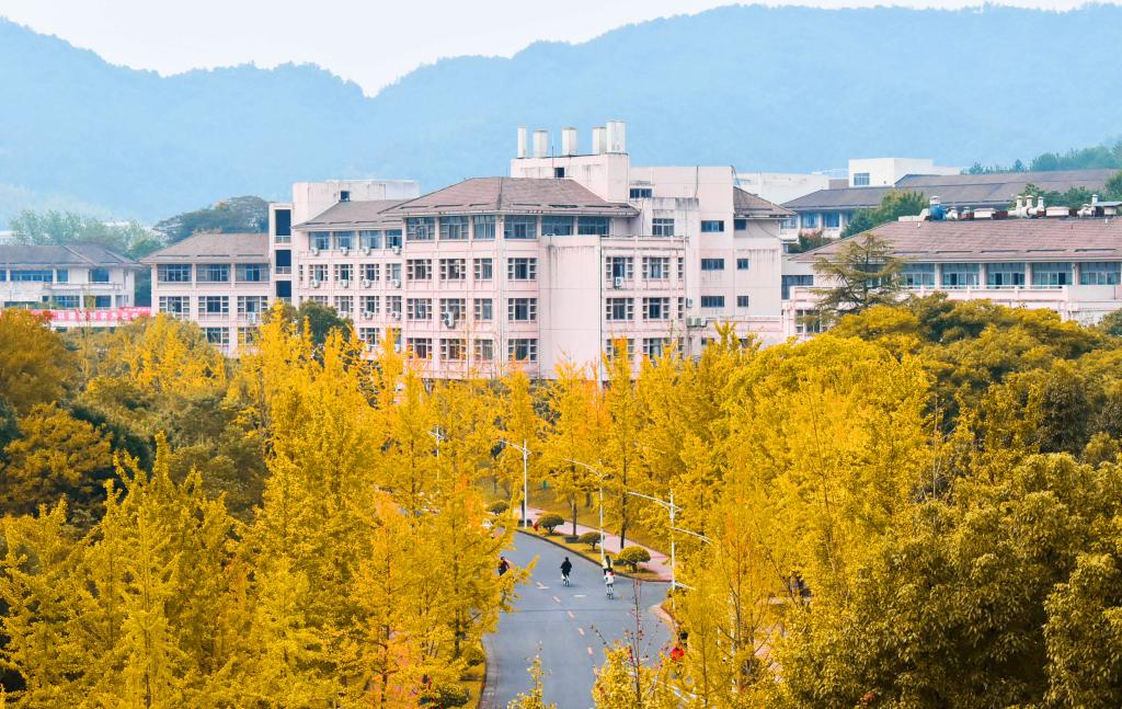 暖陽下,秋色一點點在林稍間抹開。沐浴著秋日陽光,坐在黃透的銀杏樹下,一幅幅醉美秋意畫卷正在浙農林大校園徐徐展開,葉片和枝椏的縫隙間,是光與影的完美融合,是色與彩的交織碰撞。教學樓門外的楓樹也擎起了火炬,層林盡染,漫山紅遍,那火熱的色彩點燃了生命,也點燃了秋天。松柏翠綠依舊,沉穩地微笑著,注視著這并不缺少色彩的秋。