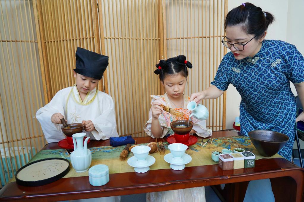 日前,在浙江農(nóng)林大學(xué)舉行的2023年“中國(guó)傳統(tǒng)制茶技藝及其相關(guān)習(xí)俗”傳承人研修班系列培訓(xùn)活動(dòng)中,兩位萌娃在活動(dòng)現(xiàn)場(chǎng)學(xué)習(xí)展示宋代點(diǎn)茶的相關(guān)技藝。