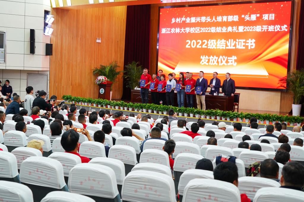 當天,在浙江農林大學進行了一年時間的學習提升后,200名2022級“頭雁”項目學員順利“出師”。他們曾經是農民專業(yè)合作社理事長、家庭農場主、農村集體經濟組織負責人、社會化服務組織負責人、市縣級農業(yè)產業(yè)化龍頭企業(yè)負責人及種養(yǎng)大戶,結業(yè)后將回到農村,發(fā)揮在大學里學習到的各方面知識,加強協(xié)同互助、結成鄉(xiāng)村產業(yè)振興的“雁陣”,為鄉(xiāng)村全面振興發(fā)揮引領示范作用。