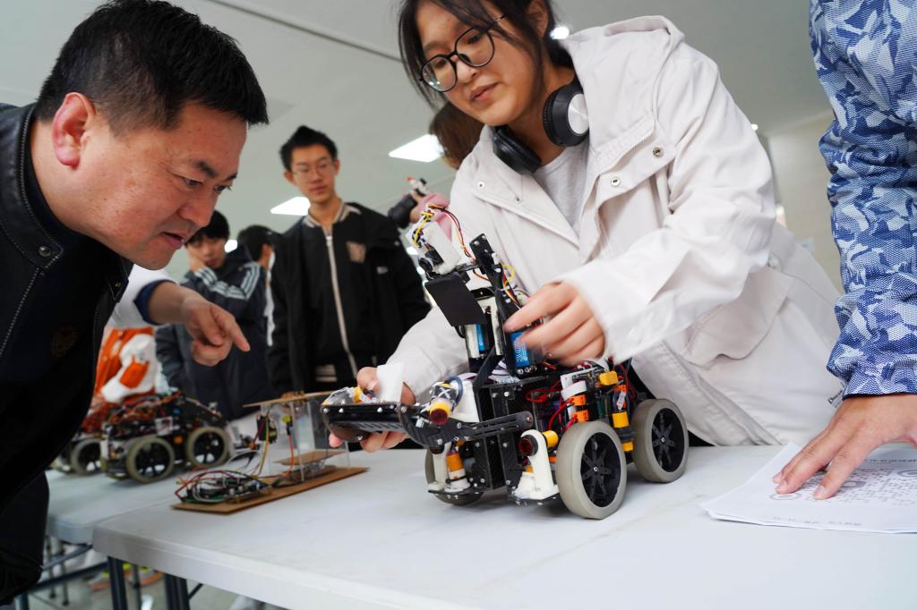日前,在浙江農(nóng)林大學(xué)舉行的“芯光智+”科技文化節(jié)上,一名學(xué)生正在向師生展示她和同學(xué)研發(fā)的機(jī)器人。