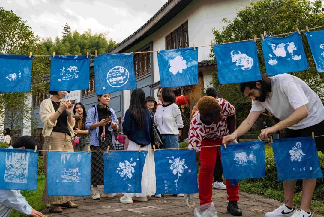 聽完講解后,留學(xué)生們很快掌握了扎染的基本方法和步驟,大家拿起工具,在白布上仔細(xì)繪制出精美的春牛圖案。