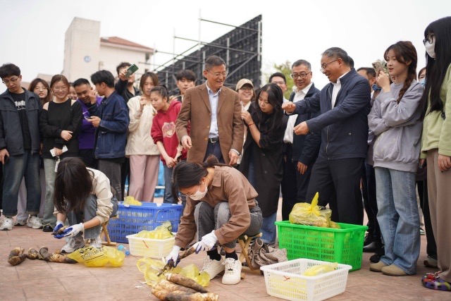 在剝筍比賽環節,學校準備了1000斤的鮮筍供師生代表比賽。100名中外師生分成十個小組,以最快速度開始剝筍。比賽現場氣氛熱烈,大家紛紛拿出看家本領,用專用刀具或手腳并用,剝筍的速度一個比一個快。最終,用時最短的小組獲得了勝利,贏得了豐厚的獎品。