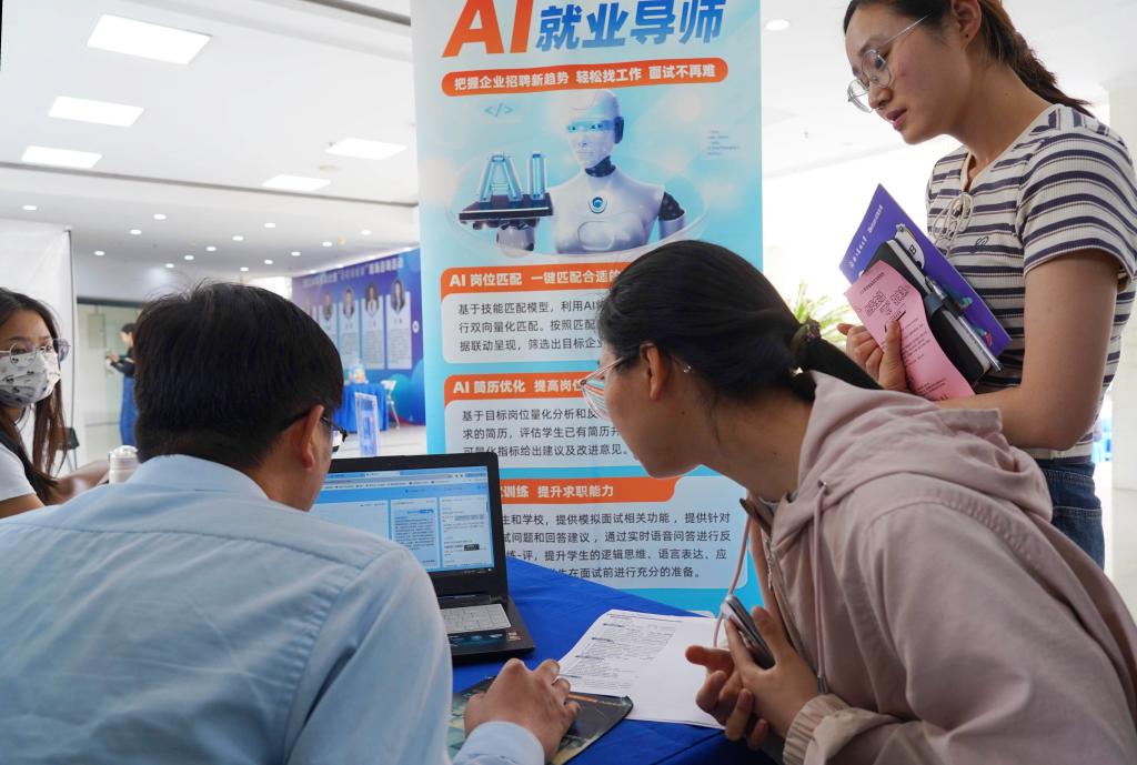 圖為一名學生帶著求職簡歷請“AI就業導師”指導完善求職簡歷、選擇求職崗位、提升面試技能。
