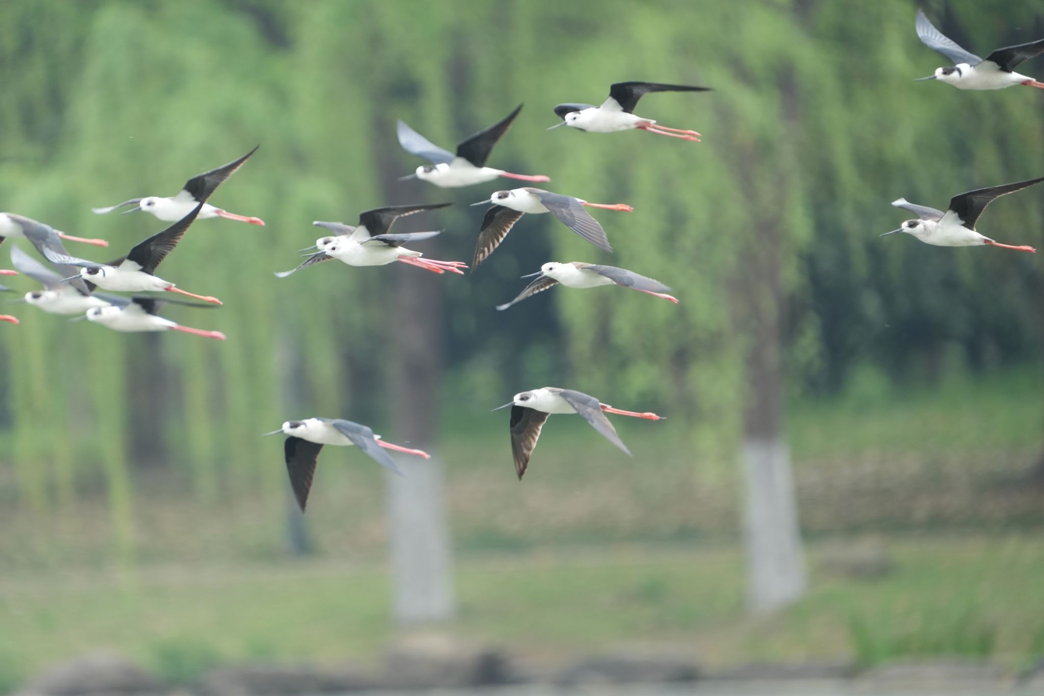 浙江農(nóng)林大學(xué)植物園辦公室教師葉喜陽回憶:“4 月 9 日清晨,我在東湖邊發(fā)現(xiàn)了這群黑翅長腳鷸,大概有近 20 只,當(dāng)時(shí)它們在淺水區(qū)覓食,偶爾在湖面飛翔。不過第二天再去,它們就已經(jīng)飛走了。”