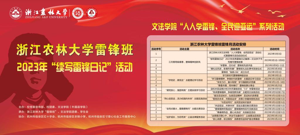 今年3月5日是毛澤東等老一輩無產階級革命家發表“向雷鋒同志學習”題詞六十周年紀念日。2月23日,習近平總書記對深入開展學雷鋒活動作出重要指示,強調要深刻把握雷鋒精神的時代內涵,讓雷鋒精神在新時代綻放更加璀璨的光芒。為弘揚“奉獻、友愛、互助、進步”的志愿精神,切實營造“時時學雷鋒 處處有雷鋒 人人做雷鋒”的良好氛圍,浙江農林大學雷鋒班決定開展3月舉行“續寫雷鋒日記”雷鋒月系列活動,歡迎全校師生踴躍參與,具體活動安排如下: