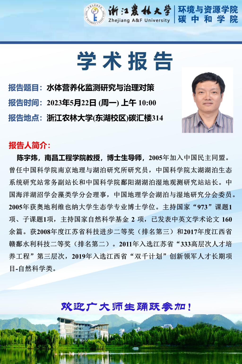 陳宇煒,南昌工程學院教授,博士生導師,2005年加入中國民主同盟。曾任中國科學院南京地理與湖泊研究所研究員,中國科學院太湖湖泊生態系統研究站常務副站長和中國科學院鄱陽湖湖泊濕地觀測研究站站長。中國海洋湖沼學會藻類學分會理事,中國地理學會湖泊與濕地研究分會委員。2005年獲奧地利維也納大學生態學專業博士學位。主持國家“973”課題1項、子課題1項,主持國家自然科學基金 2 項,已發表中英文學術論文 160 余篇。獲2008年度江蘇省科技進步二等獎(排名第三)和2017年度江西省贛鄱水利科技二等獎(排名第二)。2011年入選江蘇省“333高層次人才培養工程”第三層次,2019年入選江西省“雙千計劃”創新領軍人才長期項目-自然科學類。