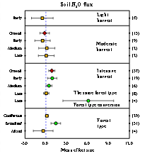 在采伐后期(恢復期> 6年),土壤N2O排放取決于現有森林類型(圖3)。同時,研究發現,對不同的森林類型而言,采伐顯著增加了闊葉林土壤的N2O通量,但對針葉林和針闊混交林沒有顯著影響(圖3)。