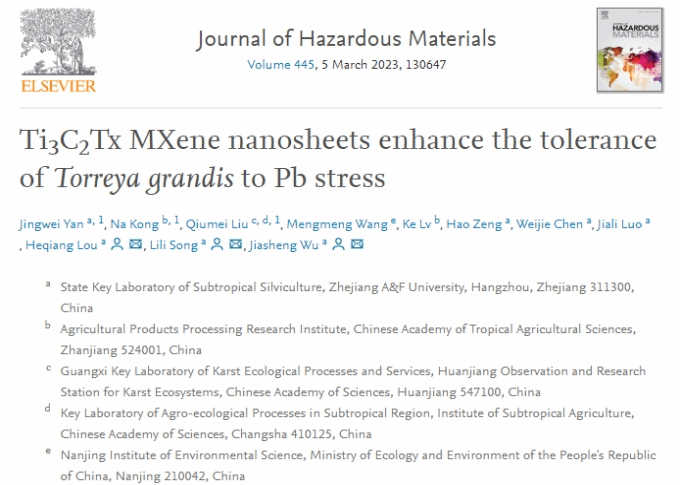 近日,國家重點實驗室特色干果團隊(吳家勝教授團隊)在國際TOP期刊《Journal of Hazardous Materials》(IF=14.224)發表了題為“Ti3C2Tx MXenenanosheets enhance the tolerance ofTorreyagrandisto Pb stress”的研究論文,較為系統地闡明了新型二維材料MXene緩解香榧“鉛毒”的作用機制。研究結果不僅為環境納米材料在植物根細胞中固定鉛離子的作用機制提供了理論依據,同時對于擴展MXene應用領域具有重要意義。