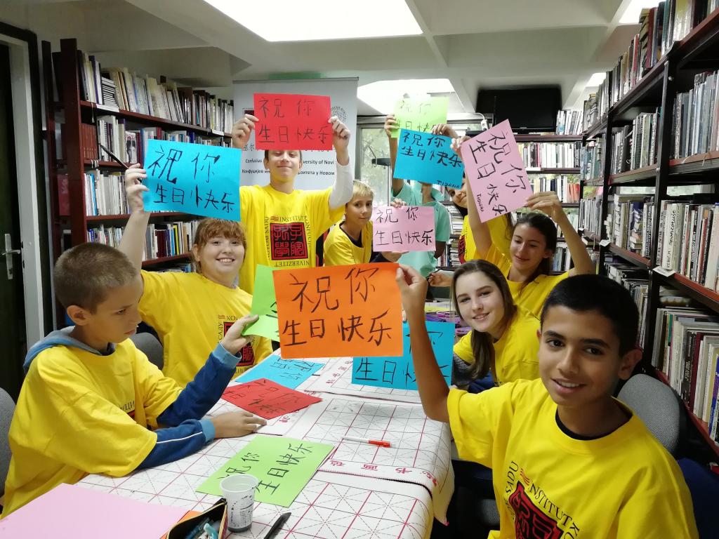 “學茶禮·敬先賢”系列活動在卡爾洛芙茲語言高中(KarlovciGrammer School)舉行,學生們品讀儒家經典《論語》,加深了解先賢孔子,并學習以茶敬師的禮儀;名曲《長江之歌》、《月亮代表我的心》等在漢語興趣班廣為誦讀傳唱。孔院還收到了來自各教學點的禮物,其中最具特色的是孔子課堂申請學校卡爾洛芙茲語言高中的剪紙,由師生共同創作完成的一幅長達十米的“手拉手”剪紙作品,象征著中塞關系的親密友好和天下孔院一家親。